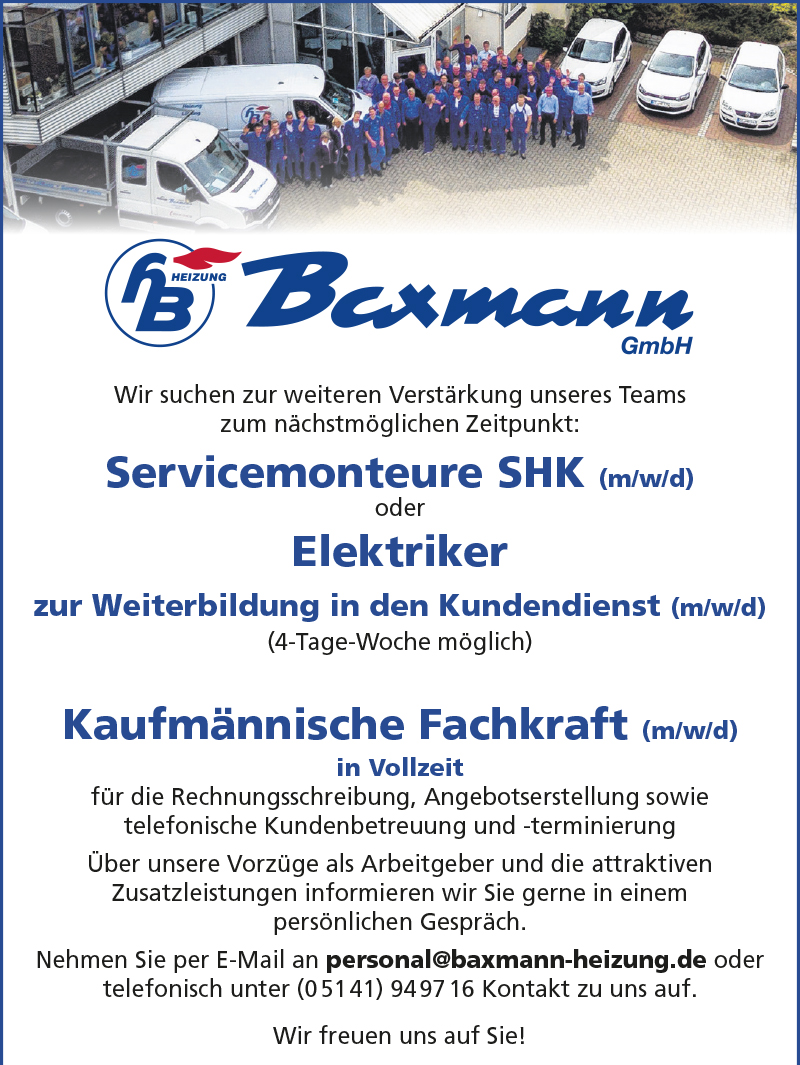 Copyright © 2012 Helmut Baxmann Heizungsbau GmbH - Fuhrberger Straße 129 - 29225 Celle - 0 51 41 / 94 97 0 - info@baxmann-heizung.de | Impressum | Datenschutz